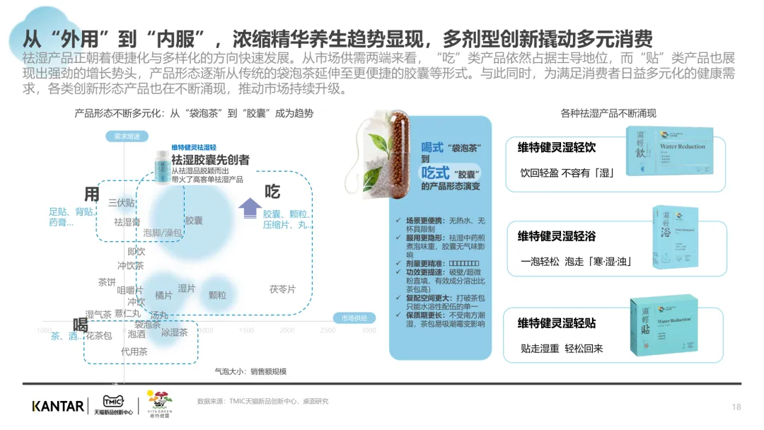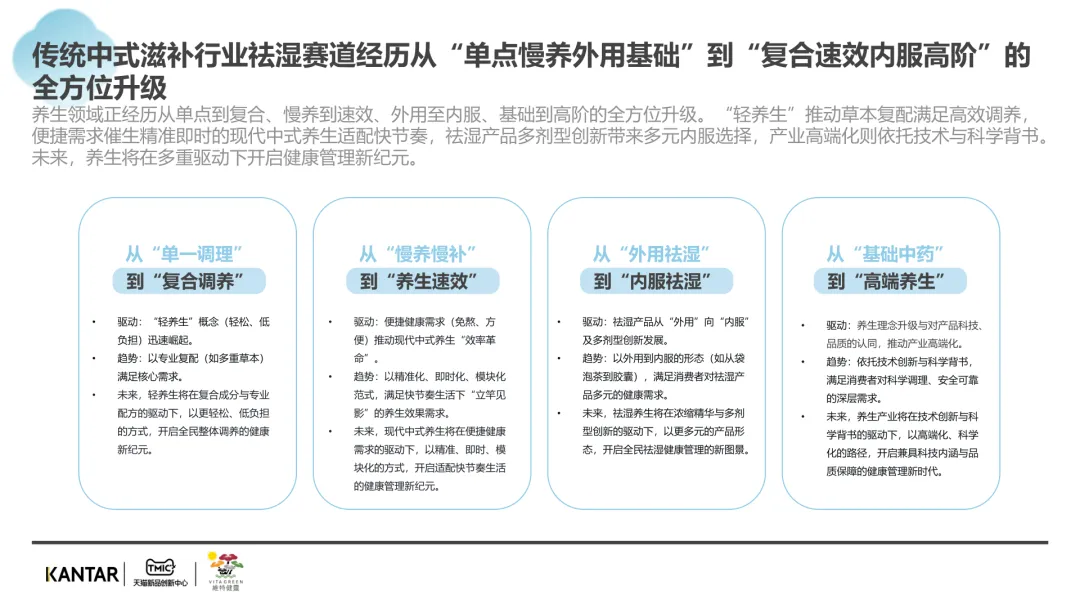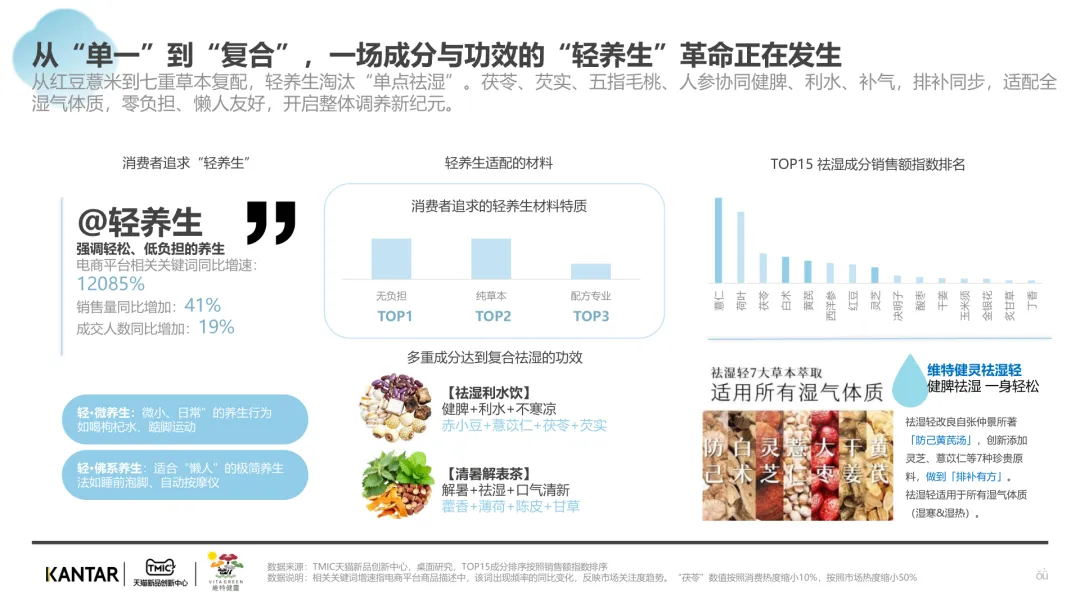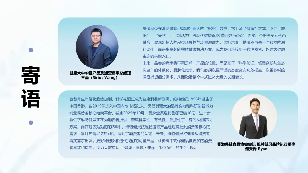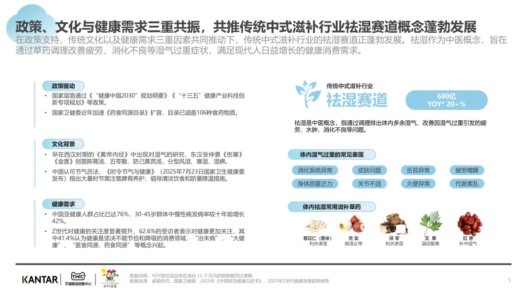 导读:报告聚焦祛湿赛道发展现状与趋势,在政策支持、传统文化传承及健康需求增长的三重驱动下,祛湿赛道成为中式滋补核心增长点,市场规模达 680 亿元,年增速超 20%。赛道呈现强季节性特征,春后回南潮湿与夏季三伏天形成需求高峰。区域上南方主导市场,长三角、珠三角城市群贡献 65% 销售额,北方高湿天气推动需求崛起。产品形态覆盖食补、个护等多元品类,百元以上价格带增速显著,维特健灵等品牌凭借科研实力领跑市场。核心消费群体以 30 + 已婚女性为主,Z 世代祛湿意识觉醒,睡眠与疲劳问题是主要痛点。行业正经历全方位升级,从单一成分转向草本复配,从慢养转向便捷速效,从外用转向内服主导,从基础产品走向高端化、科学化。未来,成分创新、场景拓展与科学背书将成为赛道竞争核心。