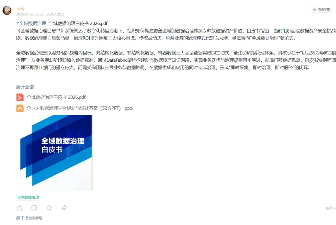 木木自由· 数据分析·领地 《全域数据治理白皮书》系统阐述了数字化转型浪潮下,组织如何构建覆盖全域的数据治理体系以释放数据资产价值。白皮书指出,当前组织面临数据资产安全挑战加剧、数据治理能力瓶颈凸显、治理ROI提升困难三大核心困境,传统被动式、脱离业务的治理模式已难以为继,亟需转向"全域数据治理"新范式。