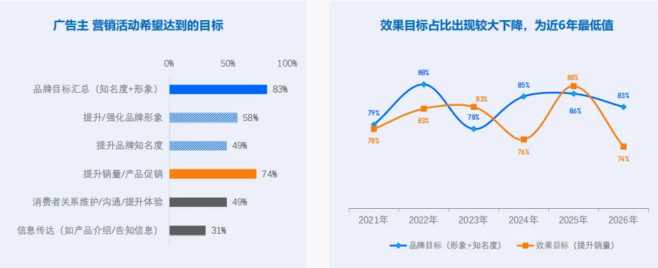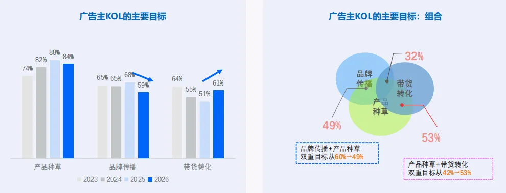 目标双重奏:53% 的广告主在 KOL 投放中追求 “产品种草 + 带货转化” 的双重目标,纯品牌传播的比例在下降。