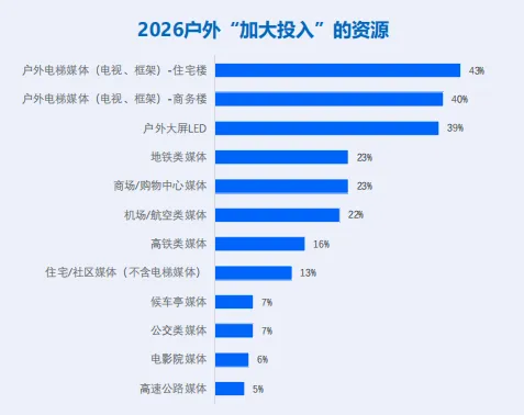 户外媒体回暖:电梯媒体与 LED 大屏投资意愿增长约40%。线上流量越贵,线下确定性流量越香。
