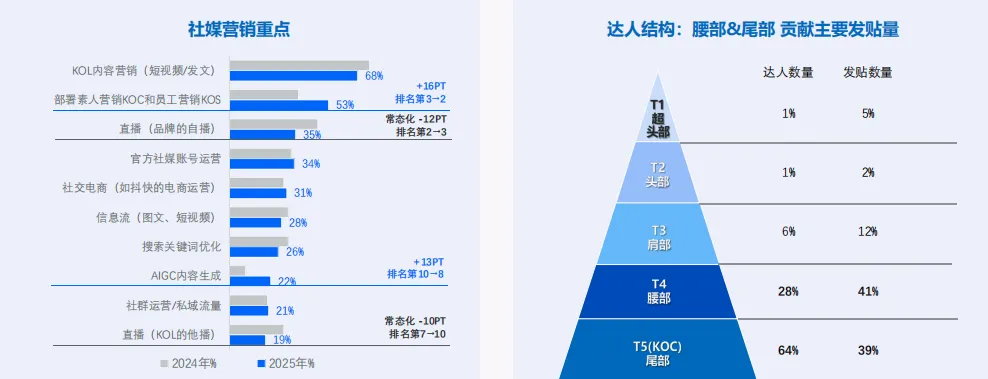 素人营销上位:“部署 KOC 与员工营销 KOS” 跃升为社媒营销重点工作的第 2 位(增长 16pt)。真实的人格背书比精美的官方物料更具穿透力。