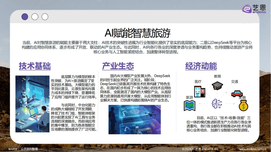 2025年中国智慧旅游市场规模有望突破14.5万亿元,人工智能已成为推动旅游市场持续增长与智慧转型的核心驱动力。AI对旅游产业的赋能基于技术突破性进展与应用协同体系两大支柱,形成了开放联动的产业生态,其技术体系涵盖底层算力与模型平台、中层AI能力与业务中台、前端场景化应用的三层架构,推动旅游业向智能化、个性化与高效化演进。