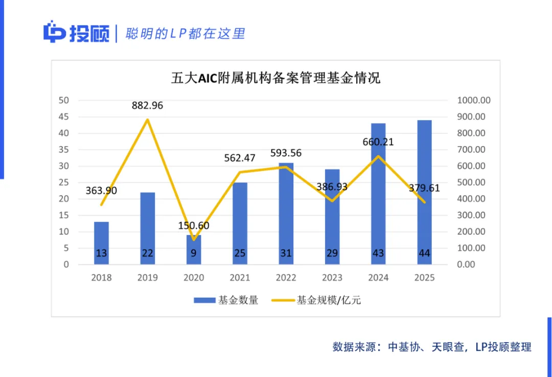回顾2018年至2025年的基金备案历史,五大AIC的基金业务呈现出明显的阶段性波动特征,折射出政策与市场环境的变迁。