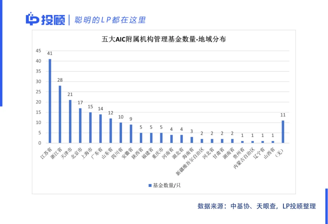 在五大AIC管理基金的地域分布上,呈现出“数量看江浙,规模看京川”的错位格局: