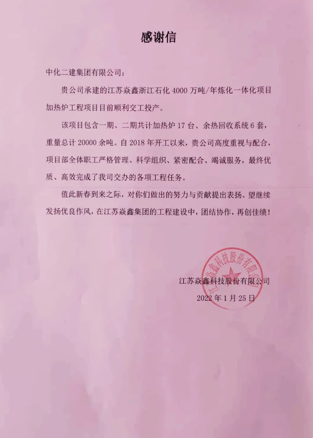 信中提到,自2018年项目开工以来,项目部严格管理、科学组织、紧密配合、竭诚服务,优质高效地完成了所有加热炉及余热回收系统的安装,并顺利交工投产。特此对公司表示感谢!