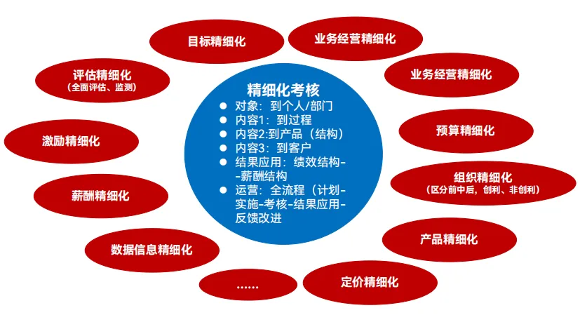 精细化绩效管理核心是考核激励到个人,基于个人业绩贡献的准确、及时核算评价,给予个人及时的回报、奖惩和改进提升方案,促进个人绩效的持续改进与员工积极性的持续保持。同时在组织层面,银行通过精细化绩效管理将总行的经营导向传导、管理控制、考核评价、奖惩到个人,实现“上下同欲”,支撑全行战略实现。精细化绩效管理对于高竞争态势下寻求内涵式增长路径、打造内生动力的多层级机构银行而言,具有以下重要的意义和价值。