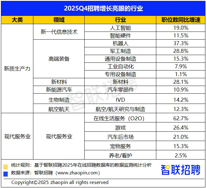 2025年四季度另一人才需求增长极为现代服务业,在线生活服务(O2O)以62.7%的职位数同比增速遥遥领先,显示出数字化服务在消费领域的深度融合与模式创新。游戏(26.4%)、汽车后市场(21.0%)、宠物服务(15.3%)、养老/看护(2.5%)等行业依然保持较快增长,满足居民日益多样化、品质化的生活服务需求。