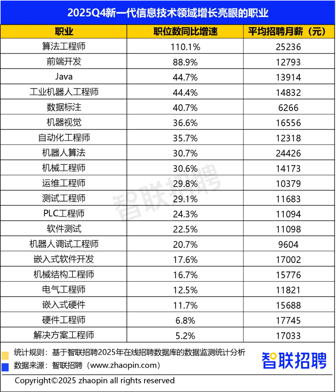 随着大模型进入应用深化期、产业数字化加速推进、智能硬件向工业端全面渗透,2025年四季度新一代信息技术领域扩张势能强劲,带动人工智能和智能硬件两大行业相关技术人才需求上扬。