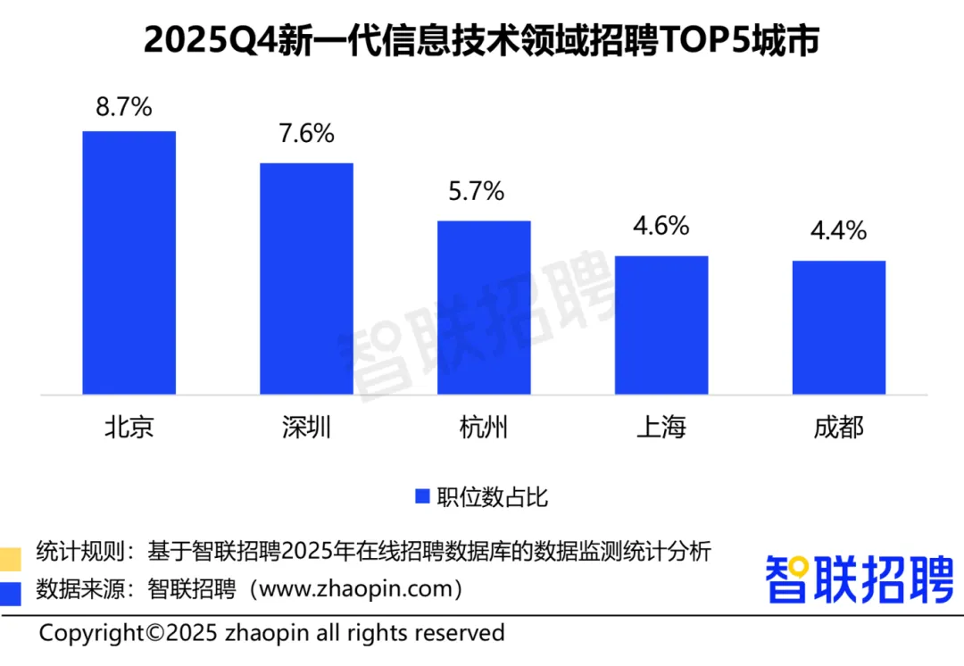 2025年四季度,新一代信息技术的人才需求高度集中于科技创新中心城市。北京(8.7%)、深圳(7.6%)、杭州(5.7%)的职位数占比位列前三,上海(4.6%)和成都(4.4%)紧随其后。这些城市在人工智能、智能硬件等前沿方向不断扩张产业布局、投入科研资源,形成了高技术产业集聚效应,对相关人才需求旺盛。