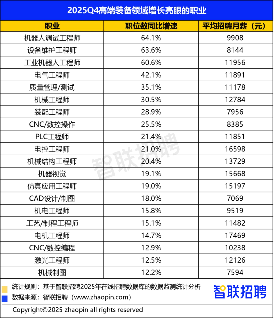 在“强链补链”“智能工厂”“机器换人”等政策与市场双重推动下,高端装备行业投入持续上行。从亮点职业看,机器人方面,机器人调试工程师四季度职位数同比增速为64.1%,是高端装备领域中增速最快的职业;工业机器人工程师增速也达60.6%,与机器人行业的增长态势相呼应。
