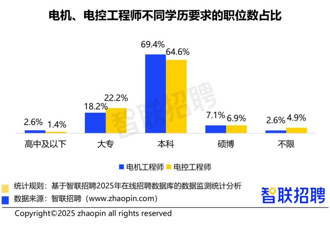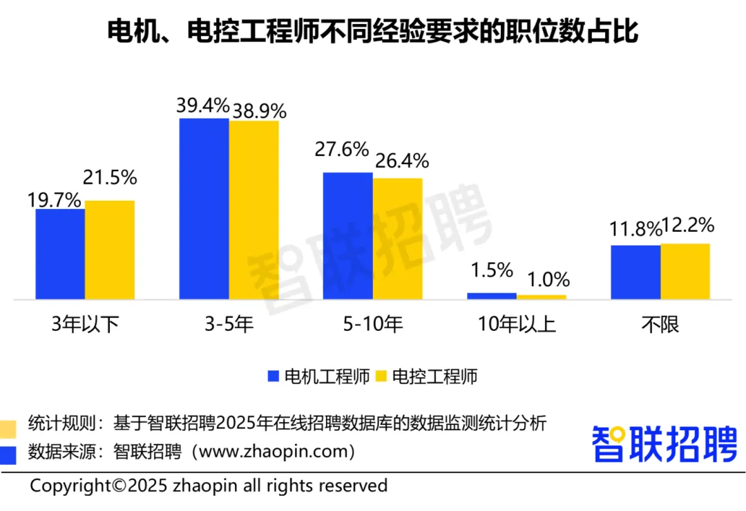 这种稀缺性与岗位门槛有关。学历方面,电机工程师和电控工程师的招聘职位中,要求本科及以上学历的分别占比76.5%和71.5%,是绝对主体。经验方面,要求3-5年工作经验的职位数占比分别为39.4%和38.9%。这表明,企业对此类核心研发与应用岗位,普遍要求求职者具备扎实的理论基础和丰富的实践经验。
