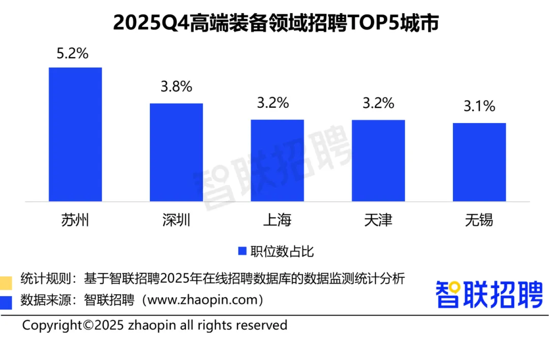 从城市分布看,高端装备领域的人才需求主要在长三角和珠三角集聚。其中,苏州(5.2%)位列全国第一,深圳(3.8%)、上海(3.2%)、天津(3.2%)、无锡(3.1%)紧随其后。