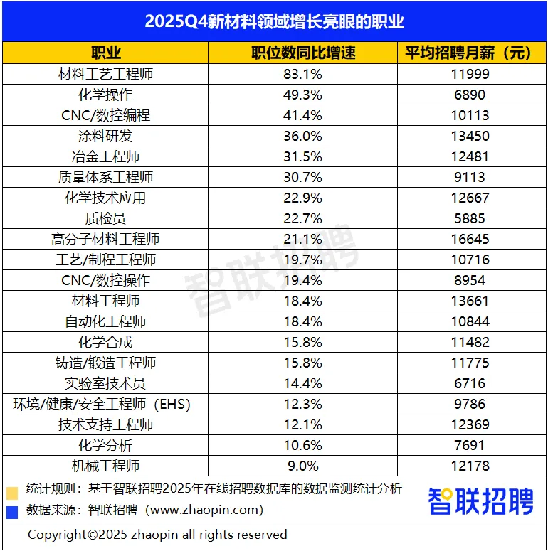 在新能源、高端装备、航空航天等行业需求持续扩大的带动下,新材料处于加速迭代与扩产阶段。企业既要加快新材料研发突破,也要同时建设更高效率、更高精度的量产能力,使得研发、工艺、质控到加工制造等岗位全面扩张。