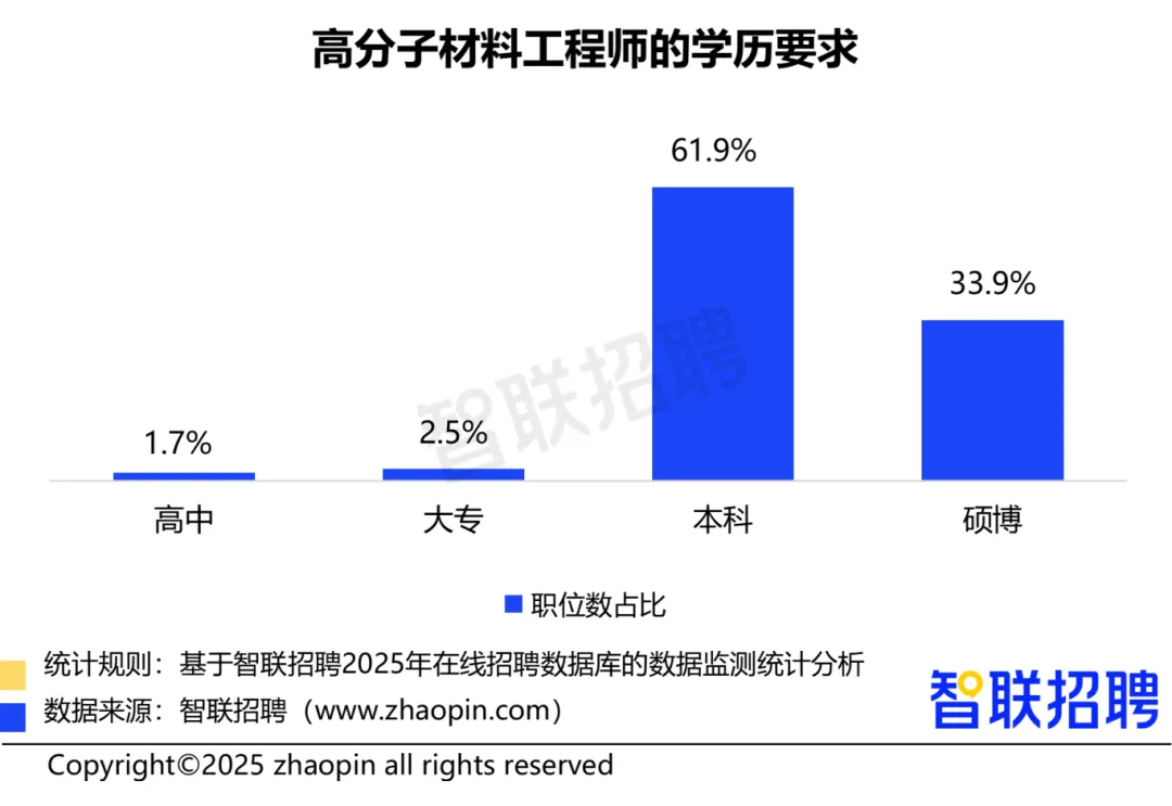 这表明,高分子材料工程师岗位的核心门槛,高度依赖于深厚的理论基础和科研能力。企业招聘时更倾向于选择受过系统科研训练的高学历人才,以应对激烈的技术竞争和快速的迭代升级。