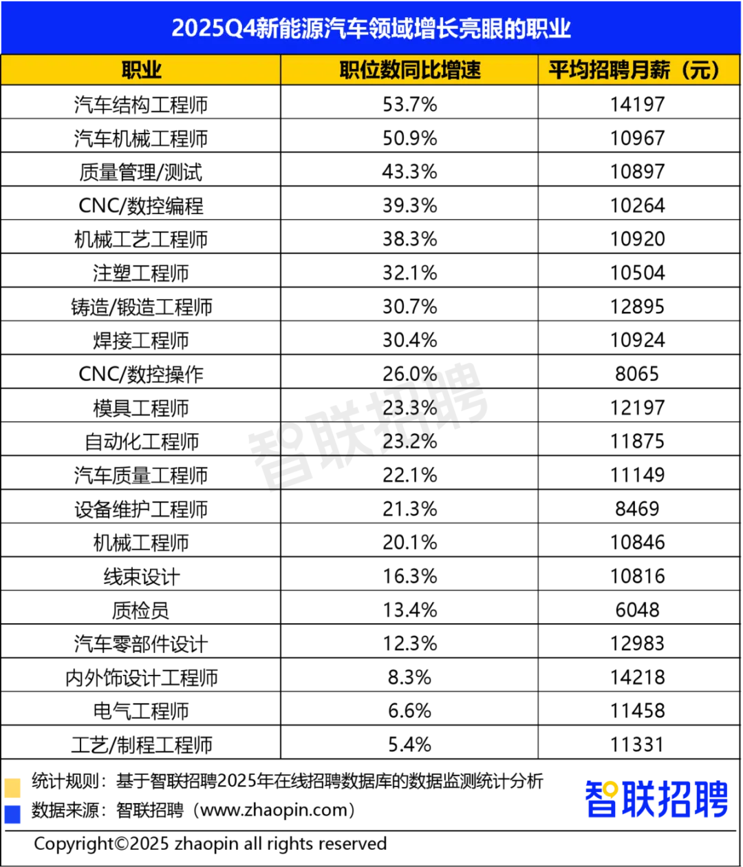 数据显示,汽车结构工程师(53.7%)、汽车机械工程师(50.9%)、机械工艺工程师(38.3%)、铸造/锻造工程师(30.7%)位居招聘需求增速前列,共同承担整车结构设计、布局优化等关键任务。其中,汽车结构工程师平均招聘月薪14197元,处于较高水平。
