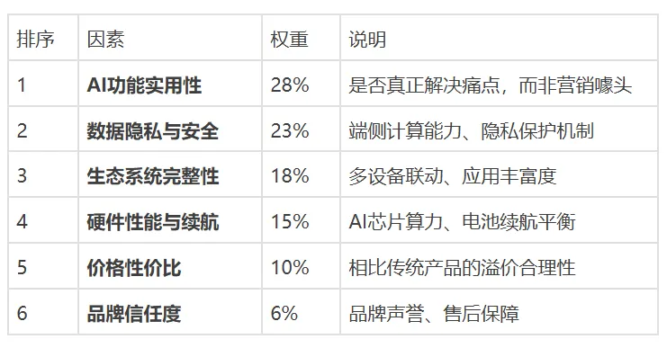 根据IDC 2024年消费者调研报告,购买AI+电子产品时的决策因素排序如下: