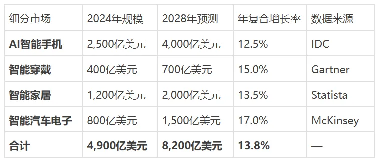 1.AI+电子产品已进入爆发期:2024年市场规模达$4900亿,预计2028年达$8200亿,CAGR 13.8%