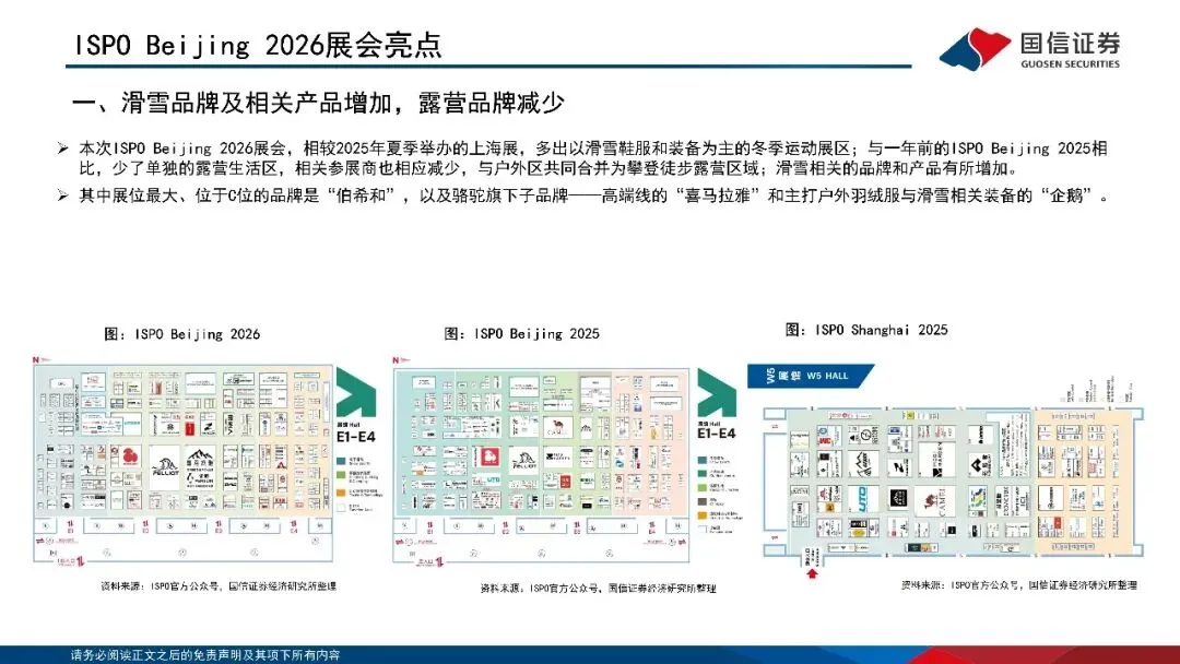 ISPOBeijing2026展会亮点。1)展会品类结构变化:滑雪品牌及相关产品增加,而露营品牌数量减少,与户外展区合并为攀登徒步露营区域。2)伯希和加码专业产品和营销,鞋类产品增加:伯希和发布会以"从世界之巅到全球赛场"为主题,发布对登山运动员、运动队的赞助支持,以及与国际体育组织、赛事体系的合作,参展产品集中展示了专业登山、滑雪及冬奥会定制装备,此外鞋子产品有单虫货架展出。3)羊毛参展商和产品增加:羊毛材质在户外服饰中的渗透率提升趋势明显,本本次展会羊毛相关面料和产品较之前都有所增加,UT0与德国南毛集团合作推出全球首创的"羊毛无缝一体织"工艺系列产品,覆盖越野与滑雪等专业场景。