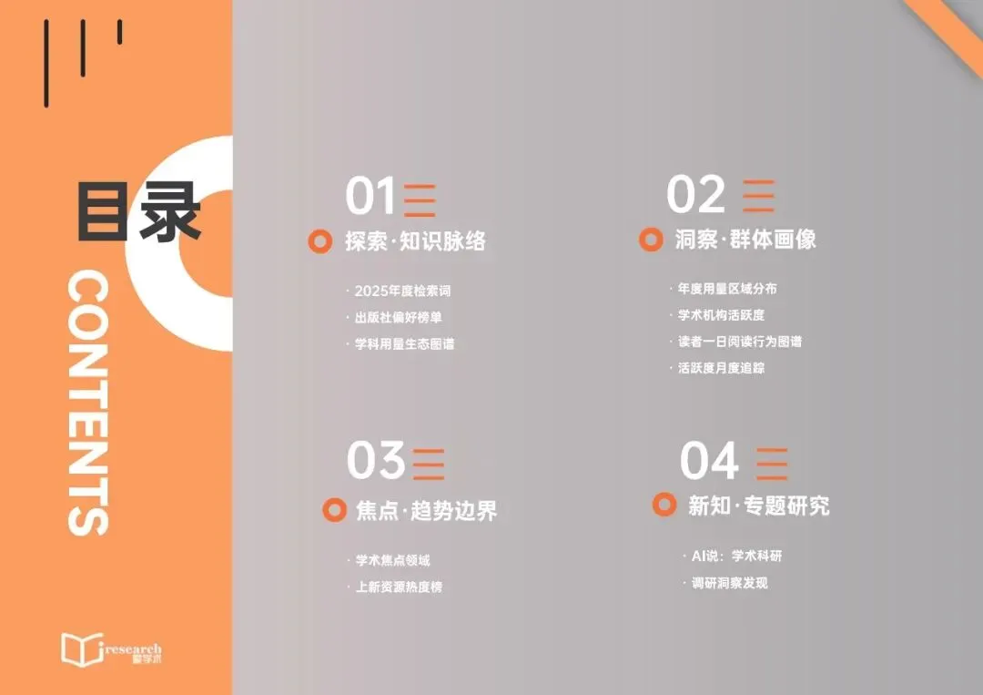 AI技术规模化落地推动学术科研范式革新,学术电子书阅读呈现跨界融合、智能赋能的鲜明特征。本报告基于爱学术平台海量使用数据与专项调研,系统梳理年度检索热点、学科用量生态、群体阅读行为等核心维度,剖析哲学、人工智能、生命科学等焦点领域的学术趋势,聚焦AI工具在科研全流程的应用现状与诉求。数据显示,跨学科知识整合需求凸显,AI已成为科研必备基础设施,而准确性、专业性与伦理合规是用户核心关切。报告为把握学术阅读发展脉络、优化科研支持服务提供了数据支撑与实践参考。