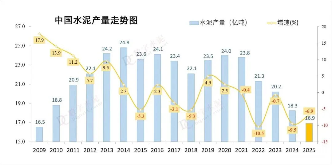 2025年全国水泥市场呈现出“量减价弱、效益承压”的严峻态势。2025年中国房地产投资延续调整态势,固定资产投资增速由正转负,致使水泥需求延续下滑的走势,2025年水泥产量为16.93亿吨,同比下降6.9%。水泥产量创2010年以来新低。由于水泥需求严重下滑,原有减量调控措施仍难以及时应对当前急速变化的市场状况,且部分区域供给约束出现阶段性松动,企业间竞合生态脆弱,导致全年水泥市场行情逐季走弱,部分地区出现水泥价格跌破成本线的“内卷式”恶性竞争,严重破坏了行业生态,导致全国库存连续高位运行,价格持续下行,效益不断承压。