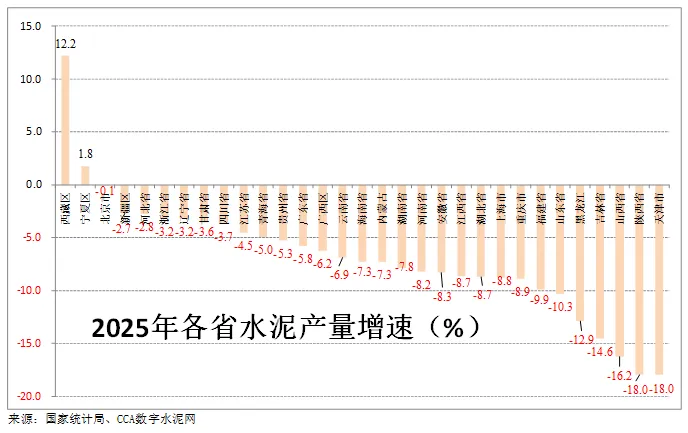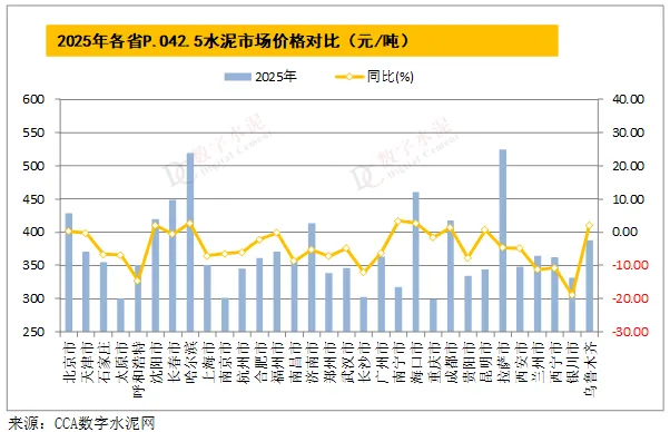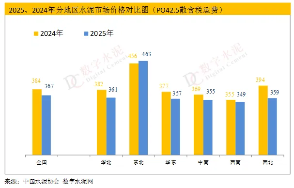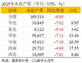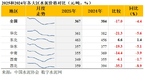 分区域情况显示,2025年六大区域中仅东北地区水泥价格同比有小幅提升,华北、华东、中南和西南等其他地区均出现不同程度下滑。其中,同比回落最为显著的是西北地区,下滑35元/吨,华北和华东地区同比下跌也达到20元/吨左右。