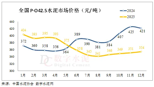 全国水泥市场平均价格呈现“前高后低、底部震荡调整”的总体走势,全年水泥市场行情呈“逐季走弱”的趋势。根据CCA数字水泥网监测,2025年全国水泥市场平均成交价(PO42.5散装水泥落地价,下同)为367元/吨,较去年下跌17元/吨,跌幅为4.4%。