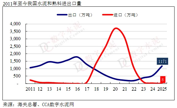 2025年中国水泥出口形势异常强劲,全年出口量突破千万吨,同比实现倍增。根据海关统计,2025年我国水泥和熟料共出口1171万吨,同比增长118%,其中:水泥出口657万吨,同比增长31%,熟料出口515万吨,同比增长1392%。