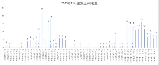 1. 赛事扎堆现象突出,项目结构适配大众需求:从赛事结构看,2025年A级赛事已形成全半程马拉松为主导的格局,同时设置全程与半程项目的赛事占比超62%,仅设半程项目的赛事占比约32%,精准契合大众跑者参与需求。时间分布上,3-4月、10月下旬-12月为赛事黄金窗口期,赛事扎堆效应明显,仅3月24日当日全国就有23场A级赛事同步鸣枪,形成集中举办高峰,也反映出优质办赛时段资源的稀缺性。