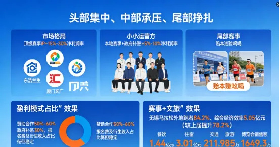 1.分层竞争格局明晰,盈利结构差异显著:运营市场呈现“头部集中、中部承压、尾部挣扎”的格局,东浩兰生、厦门文广、汇跑赛事等头部企业手握顶级赛事IP,凭借强劲招商能力与优质政府资源,净利润率稳定在15%-30%;中小运营方多依赖本地赛事与政府补贴,净利润率仅5%-10%,部分赛事甚至需以“赔本赚吆喝”的方式积累行业资源。盈利模式上,赞助合作占头部赛事收入的50%-60%,政府补贴占比约30%,报名费及衍生收入占比相对较低但稳定。其中“赛事+文旅”成为重要盈利延伸点,无锡马拉松外地跑者占比84.2%,带动综合经济效益达5.05亿元,较上届提升78.2%,其中餐饮效益1.44亿元、住宿效益3.01亿元、交通效益211.12万元、旅游效益885万元,赛前博览会线上线下销售额合计1649.3万元,展现出强大的消费带动能力。
