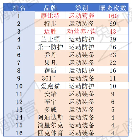 3. 虽然竞争激烈,新品牌仍然有机会脱颖而出:迈胜以43次曝光跃居总榜第三,强势挑战康比特的霸主地位,印证能量补给品类的核心价值;爱跑猫凭借精准场景切入,几乎成为马拉松肌肉贴代名词,对KT、LP等传统品牌形成挤压。运动装备领域,特步以69次曝光成为国产品牌“头号玩家”,乔丹、果凡构成第二梯队;安踏(9次)、李宁(6次)虽曝光频次较低,但聚焦高影响力赛事;阿迪达斯、亚瑟士、耐克等国际巨头曝光次数仅2-4次,主要与其聚焦顶级赛事冠名、弱化中小赛事合作的策略相关。