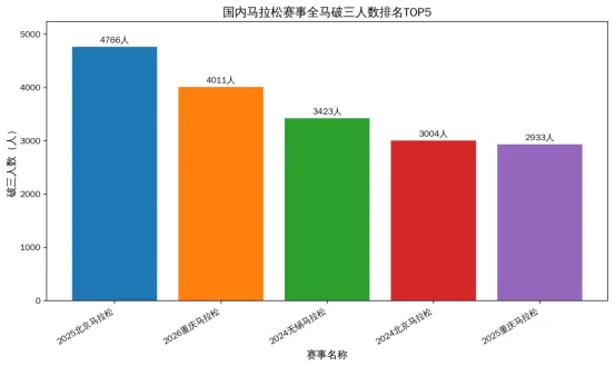 3. 四川、广西等省份则凭借特色模式突围:四川“跑遍四川”系列赛吸引18.7万名跑者参与,构建全域跑步生态;广西深耕“马拉松+旅游”模式,贺州黄姚古镇马拉松带动周边消费破千万元,形成赛事消费闭环。参赛人数方面,头部赛事虹吸效应显著,无锡马拉松2025年参赛总人数扩容至3.5万人(全程2.5万人、半程8000人、欢乐跑2000人),合计报名人数超42.9万人;北京马拉松参赛规模扩至3.2万人,4700余名选手成功“破三”,较2024年的3004人大幅增长,刷新国内马拉松“破三”人数纪录,彰显头部赛事的专业吸引力。