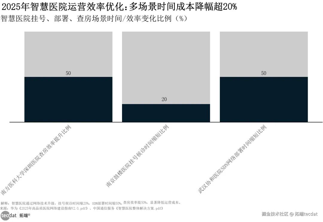 此处插入图表1-1(条形图):图表1-1展示产业链各端效率提升数据:应用端南京鼓楼医院挂号候诊时间缩短20%(患者受益),落地端武汉协和医院SDN网络部署时间缩短50%(医院降本),场景端南方医科大学深圳医院查房效率提升50%(医护提效)。3秒解读:智慧医院技术实现“患者-医院-医护”三方共赢,核心场景时间成本降幅超20%;行动建议:医院运营者可优先锁定“门诊挂号+病区网络”两大高痛点环节,参考武汉协和医院SDN部署方案(技术方:华为),3个月内完成1-2个病区改造,通过“候诊时间、部署周期”双指标验证效果。智慧医院挂号、部署、查房场景时间/效率变化比例(%)图表数据及PDF模板已分享到会员群。