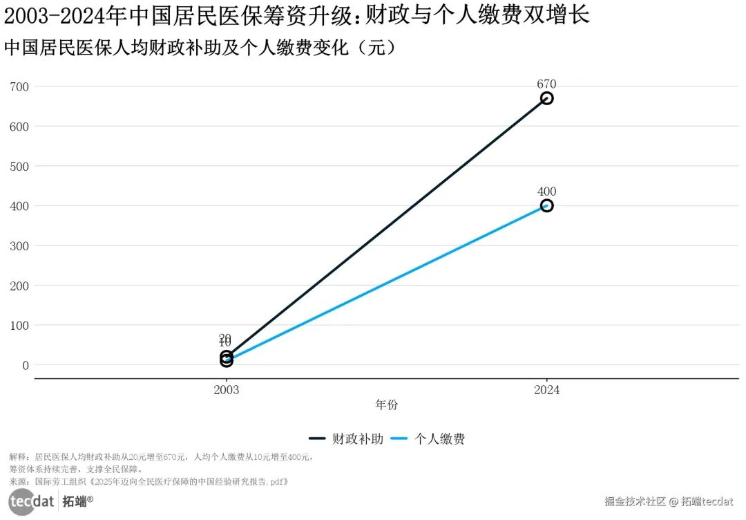 2003年中国居民医保刚起步时,筹资端(财政+个人)能力弱:人均财政补助仅20元(政府投入),个人缴费10元(参保端负担),导致保障端水平有限。随着政策推动(2016年城乡医保整合、2024年参保长效机制),筹资产业链持续完善,2024年形成“财政为主、个人为辅”的稳定模式。此处插入图表2-2(折线图):图表2-2显示筹资端增长:2024年中国居民医保人均财政补助670元(政府端),人均个人缴费400元(参保端),较2003年分别增长32.5倍、39倍。3秒解读:筹资规模翻倍支撑医保产业链可持续,财政仍是核心驱动力;行动建议:地方财政部门可结合本地GDP增速(2024年全国GDP增速5.2%),制定2025年财政补助增长计划(建议增速不低于5%),同时联合社区(经办端)开展“参保宣传周”,提升居民缴费积极性(避免断保影响覆盖端)。中国居民医保人均财政补助及个人缴费变化(元)图表数据及PDF模板已分享到会员群。为帮助医保产业链从业者(政策制定、经办、咨询)落地,交流群内提供《2025年居民医保参保扩面操作手册》(含经办流程)及中外医保政策对比表(含刚果预算执行优化建议),可进群领取。