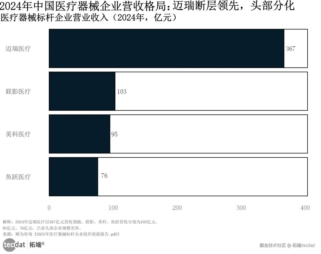 此处插入图表3-1(条形图):图表3-1展示中游制造端龙头营收:迈瑞医疗(全品类龙头)367亿元,联影医疗(影像细分龙头)103亿元,英科医疗(耗材细分龙头)95亿元,鱼跃医疗(家用器械龙头)76亿元。3秒解读:迈瑞营收是第二名3.6倍,头部效应显著,细分赛道仍有龙头机会;行动建议:中小器械企业(中游)可聚焦“耗材(如英科)、家用器械(如鱼跃)”等细分领域,6个月内完成“细分市场规模-竞品优劣势-下游渠道”调研,避免与全品类龙头正面竞争。医疗器械标杆企业营业收入(2024年,亿元)图表数据及PDF模板已分享到会员群。