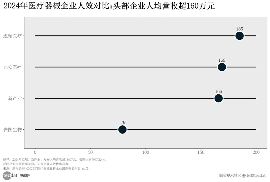 人效是医疗器械中游企业“成本控制-利润释放”的核心指标,2024年头部企业通过“流程优化(生产端)+技术升级(研发端)”提升人均营收,部分企业仍存在“人员冗余+流程滞后”问题。此处插入图表3-2(条形图):图表3-2显示运营端效率:2024年迈瑞医疗(龙头)人均营收185万元/人,新产业(IVD细分)166万元/人,九安医疗(家用检测细分)169万元/人,安图生物(IVD企业)79万元/人。3秒解读:头部企业人效是安图生物2.3倍,效率差距源于“全产业链协同”;行动建议:安图生物等中小IVD企业可对标迈瑞“生产排班优化(中游)+销售渠道整合(下游)”模式,3个月内试点“人均营收提升计划”(目标提升10%),优先优化“生产冗余岗位+低效销售区域”。医疗器械标杆企业人均营收(2024年,万元/人)图表数据及PDF模板已分享到会员群。