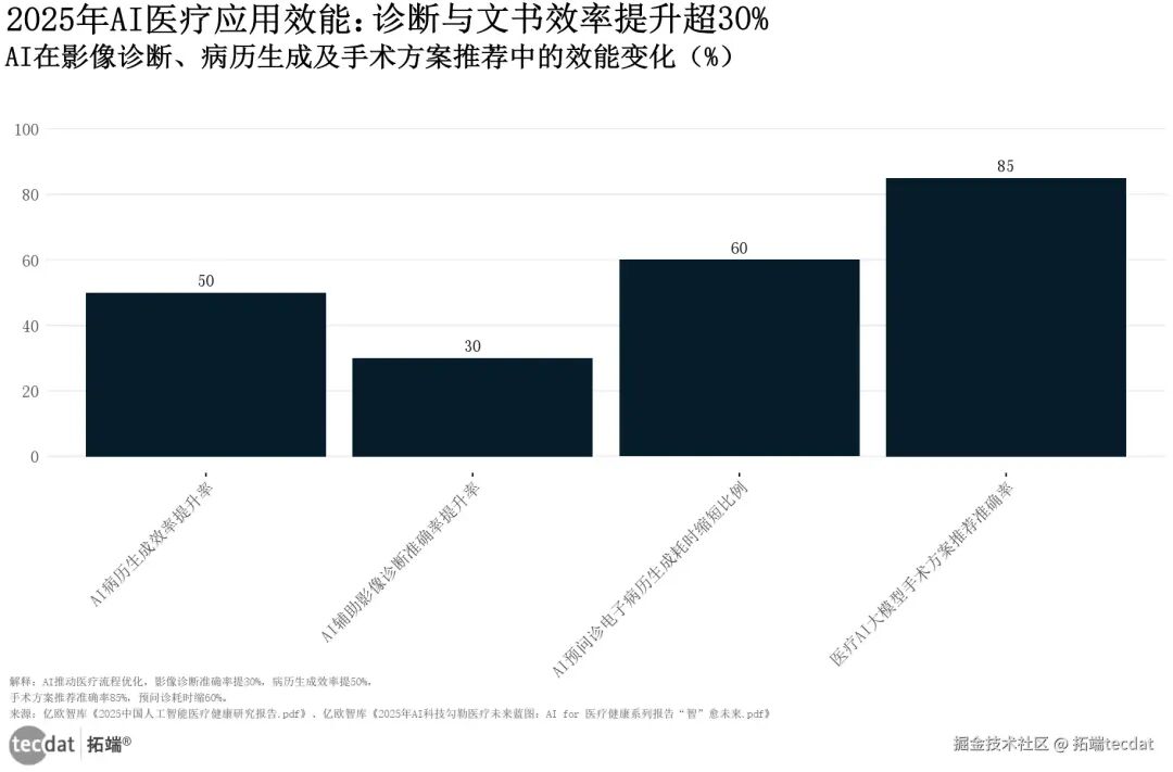 过去医疗中游应用端(医生)面临“阅片慢、文书繁”痛点——医生阅片需30分钟/例,病历生成耗时1小时,AI技术(上游算法)落地后,核心流程效率大幅提升。此处插入图表4-1(条形图):图表4-1显示应用层效能:AI辅助影像诊断准确率提升30%(影像应用),AI病历生成效率提升50%(文书应用),医疗AI大模型手术方案推荐准确率85%(手术应用),AI预问诊电子病历生成耗时缩短60%(门诊应用)。3秒解读:AI让医疗中游应用端效率提升超30%,诊断准确率达高值;行动建议:医院(下游落地端)可优先在放射科(影像)、门诊(预问诊)试点AI应用,先引入AI辅助影像诊断系统(推荐参考《2025中国人工智能医疗健康研究报告.pdf》技术方案),6个月内通过“阅片准确率、耗时”双指标统计效果。AI在影像诊断、病历生成及手术方案推荐中的效能变化(%)图表数据及PDF模板已分享到会员群。