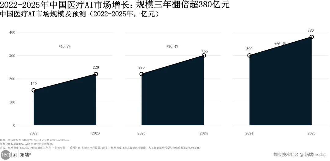 2022年中国医疗AI市场(全产业链)规模150亿元,随着政策支持(2024年《推动未来产业创新发展的实施意见》)与技术成熟(上游算法迭代),市场持续扩张,2025年预计突破380亿元,年复合增长率超40%,商业化集中在“基层医疗(下游)-细分应用(中游)”。此处插入图表4-2(折线图):图表4-2显示产业链规模:2022-2025年中国医疗AI市场规模从150亿元增至380亿元,2023年220亿元,2024年预计300亿元。3秒解读:市场三年翻倍,商业化加速,中游应用端是增长核心;行动建议:AI企业(中游)可聚焦基层医疗场景(下游高需求),开发低成本AI辅助诊断产品(适配基层预算),同时联动医保部门(政策端),推动AI服务纳入报销(提升下游付费意愿)。中国医疗AI市场规模及预测(2022-2025年,亿元)图表数据及PDF模板已分享到会员群。