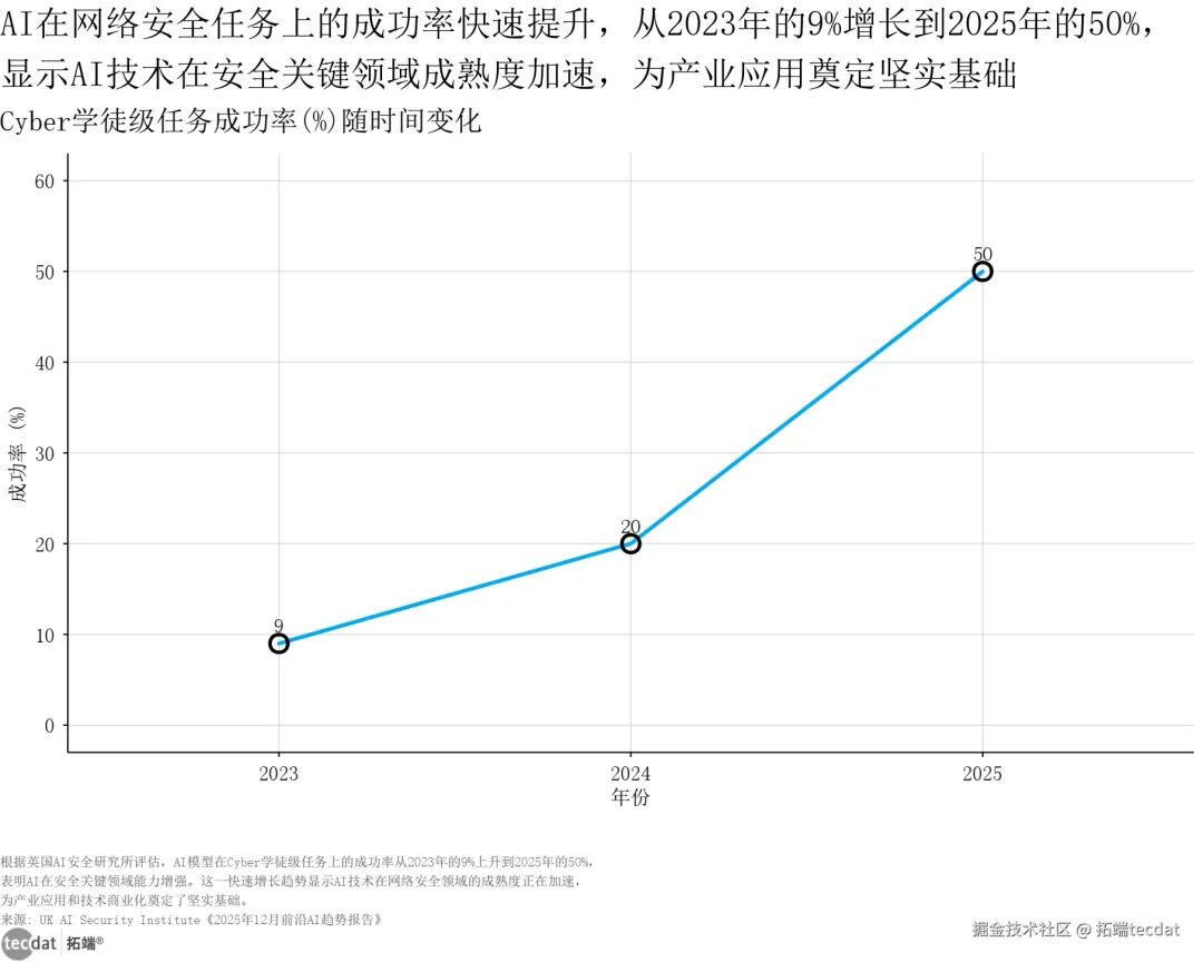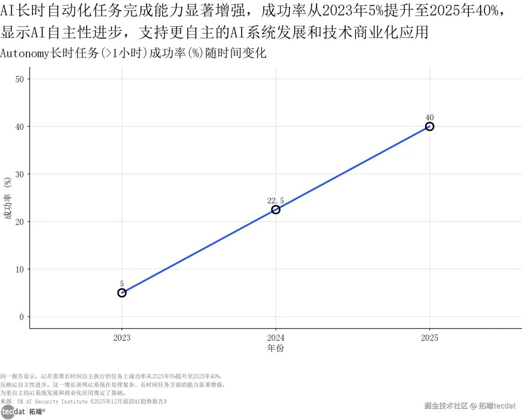 AI的演进从未如此迅猛。早年间,大语言模型(LLMs)主导了技术叙事,美欧企业普遍将其视为AGI的最优路径,但随着应用深入,其抽象推理不足、易“幻觉”等短板逐渐显现。2023年起,中国率先转向具身智能赛道,将智能体与物理系统结合,通过“身体-大脑-环境”的交互培育智能,形成了与美欧截然不同的技术路线。这一转向并非偶然。2023年北京、上海等地率先布局具身智能创新中心,2024年《人形机器人创新发展指导意见》明确技术攻关方向,2025年“具身智能”首次写入政府工作报告,政策持续加码推动技术从实验室走向产业。与此同时,全球AI用户基数持续扩大,2025年中国生成式AI用户达5.15亿,占全球总量超50%,庞大的市场需求进一步加速了技术落地。在技术与市场的双重驱动下,AI能力实现跨越式提升。网络安全领域,AI处理Cyber学徒级任务的成功率从2023年的9%飙升至2025年的50%;自主任务执行方面,长时自动化任务成功率从5%突破至40%,这些数据印证了AI正从“能对话”向“能干活”质变。