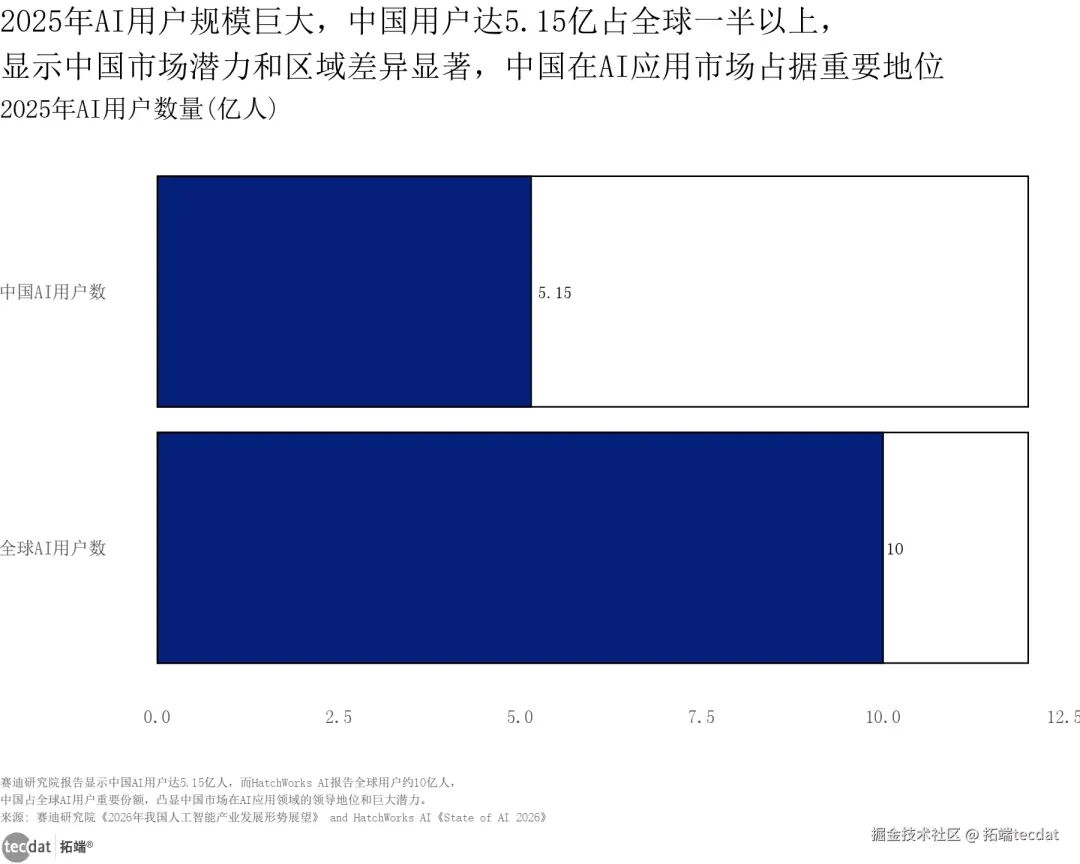 AI长时自动化任务完成能力增长折线图2 图表数据及PDF模板已分享到会员群用户规模方面,中国市场的领先地位同样显著。2025年中国生成式AI用户规模达5.15亿人,全球总量约10亿人,中国用户占比超50%,成为全球AI应用最活跃的市场。这一数据既反映了中国用户对新技术的接受度,也为本土AI企业提供了丰富的场景测试与迭代机会。