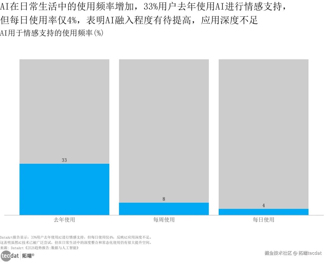 全球AI用户规模中国与全球对比横向条形图表3 图表数据及PDF模板已分享到会员群从用户使用行为来看,AI在日常生活中的渗透呈现“浅尝辄止”的特征。33%的用户在2025年使用AI进行情感支持或社交互动,8%的用户每周使用,仅4%的用户达到每日使用频率。这一现象背后,既有用户对AI功能边界的探索阶段属性,也反映出当前AI在日常场景的实用性仍有提升空间。
