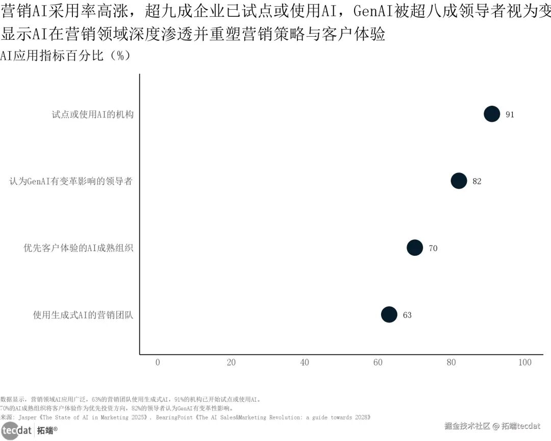 营销行业的AI应用已进入普及化阶段。63%的营销团队已启用生成式AI工具,91%的机构已启动AI试点或正式应用,战略认知层面,70%的AI成熟组织将客户体验列为AI投资的核心优先级,82%的行业领导者认定生成式AI对业务具有变革性影响。