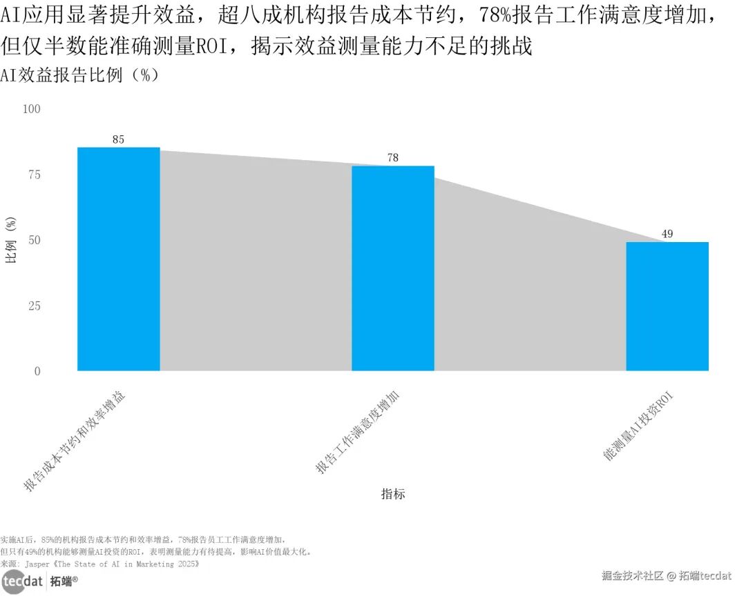 营销AI应用指标刻度线图表6 图表数据及PDF模板已分享到会员群从应用效益来看,AI的价值已初步显现:85%的机构报告实现成本节约和效率增益,78%的机构反馈员工工作满意度提升。以Klarna为例,通过AI工具降低营销agency支出25%,图片生产周期从6周压缩至7天,年节省成本超1000万美元,印证了AI在标准化内容生产中的显著成效。但关键痛点突出:仅49%的机构能准确测量AI投资的投资回报率(ROI),反映出行业在AI价值量化、效果归因等方面仍存在能力短板,制约了规模化投入。