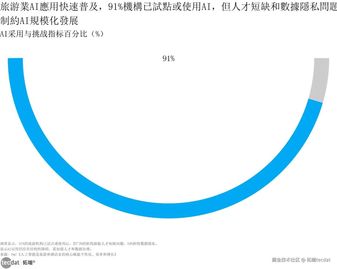 旅游AI应用驱动因素雷达图表9 图表数据及PDF模板已分享到会员群尽管应用普及迅速,但行业面临结构性障碍:73%的机构报告存在AI人才短缺问题,64%的机构对数据隐私风险表示担忧,这两大挑战成为制约旅游行业AI从“试点尝试”向“规模化落地”跨越的核心瓶颈。尤其在跨境旅游场景中,数据跨境流动合规与用户隐私保护的平衡,成为企业面临的突出难题。3秒解读:旅游AI应用需求旺盛,但人才缺口与数据隐私风险形成双重制约,场景适配性是关键。对应人群行动建议:旅游企业需同步搭建人才团队与数据安全体系,优先落地客户咨询、行程规划等低风险场景;行业协会可推动AI人才培训与数据安全标准制定;技术服务商可开发轻量化、易部署的旅游AI解决方案,降低中小企业应用门槛。
