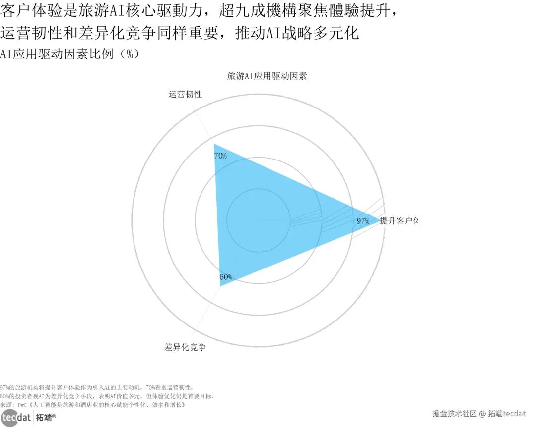 旅游AI采用与挑战半圆环图表8 图表数据及PDF模板已分享到会员群从应用驱动因素的细分维度来看,旅游行业对AI的需求呈现多元化特征,客户体验、运营效率、竞争差异化等均为核心诉求,这也决定了行业AI应用需兼顾多场景适配。