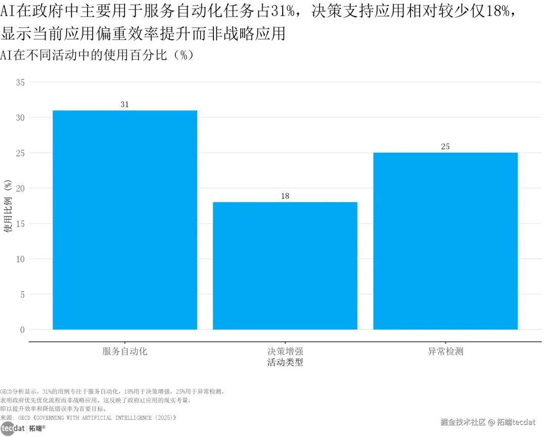 政府领域的AI应用以基础场景为主,重点围绕效率提升展开,战略级应用渗透率偏低。31%的政府AI用例聚焦服务自动化,25%用于异常检测,仅18%的用例涉及决策增强,这一结构表明,政府AI应用当前仍偏重流程优化,在政策制定、战略规划等高端场景的价值释放不足。