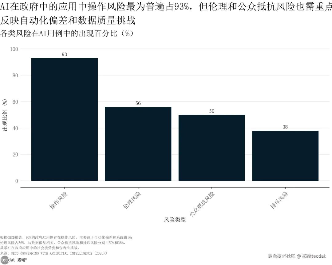 政府AI使用活动类型条形图表11 图表数据及PDF模板已分享到会员群从风险分布来看,操作风险最为突出,93%的政府AI用例存在此类风险,主要源于自动化偏差和系统错误;伦理风险占比56%,与训练数据偏见、算法公平性相关;公众抵抗风险和排斥风险分别占50%和38%,凸显AI在政府应用中的社会接受度和包容性挑战。