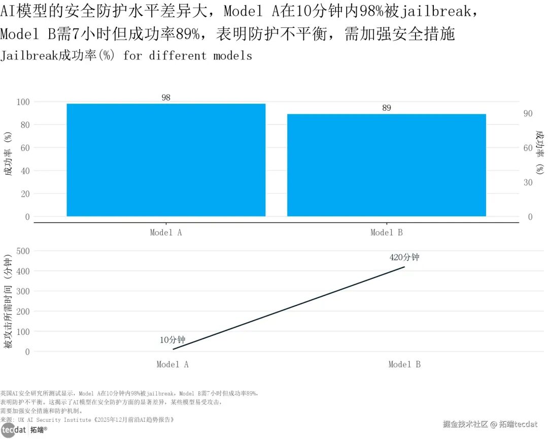 随着AI应用范围扩大,安全风险与治理挑战日益凸显,“创新快、治理慢”的矛盾持续加剧。模型安全防护、企业风险治理、全球规则构建等多个维度的短板,成为制约AI健康发展的关键因素。在模型安全防护方面,不同AI模型的安全韧性差距巨大。早期模型(Model A)仅需10分钟即可被成功Jailbreak,成功率高达98%;较新模型(Model B)虽需7小时(420分钟)才能被攻破,但成功率仍达89%。这一差异反映出AI模型安全防护的不均衡性,部分模型的安全措施仍难以抵御针对性攻击,安全能力建设滞后于技术创新。
