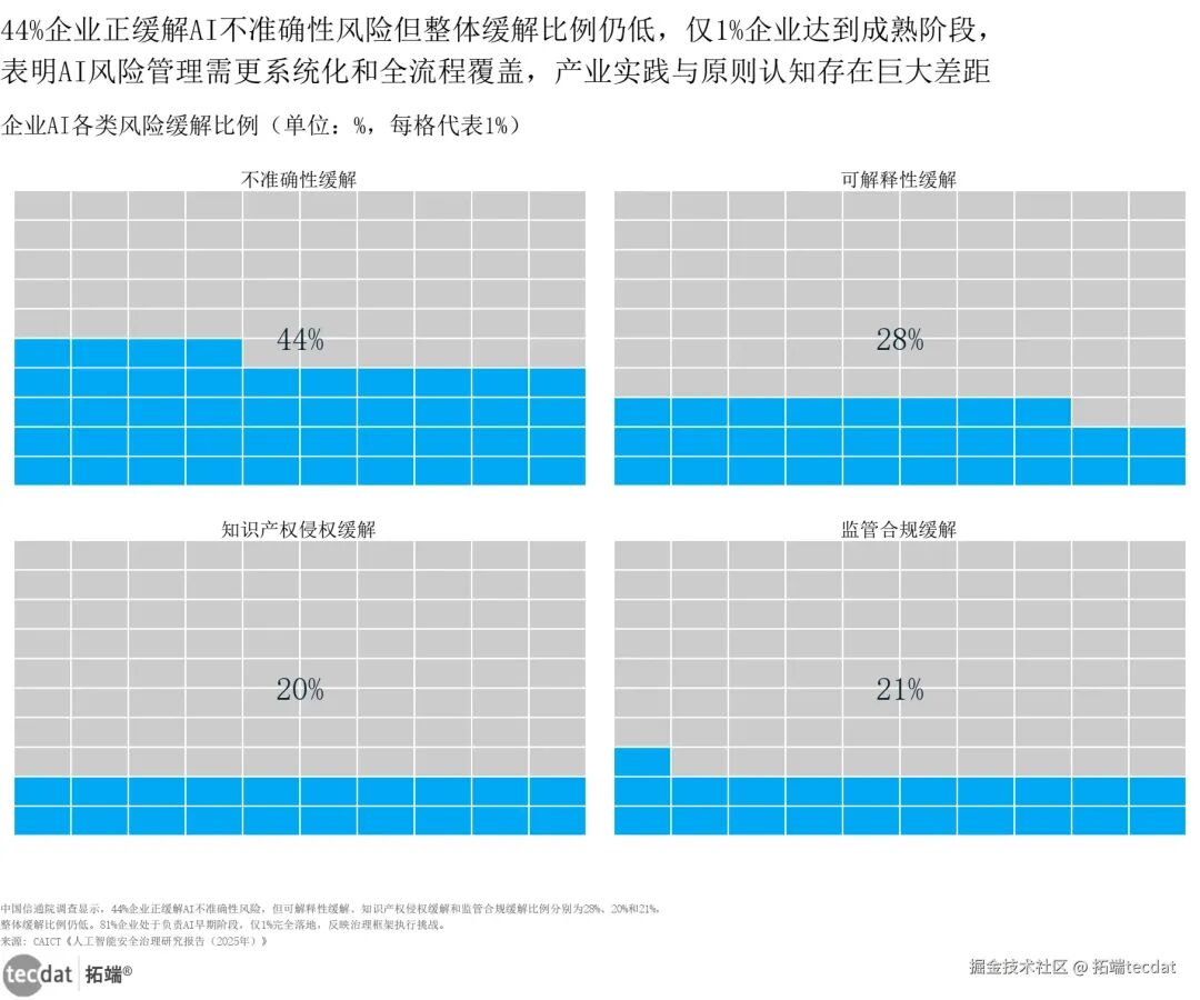 AI模型Jailbreak成功率与时间双轴图表5 图表数据及PDF模板已分享到会员群在企业风险治理方面,整体缓解比例偏低。44%的企业正在采取措施缓解AI不准确性风险,28%的企业关注可解释性风险缓解,知识产权侵权和监管合规风险的缓解比例仅为20%和21%。从治理成熟度来看,81%的企业仍处于负责任AI应用的早期阶段,仅1%的企业实现了治理框架的完全落地,产业界在AI风险治理的执行层面仍存在巨大差距。