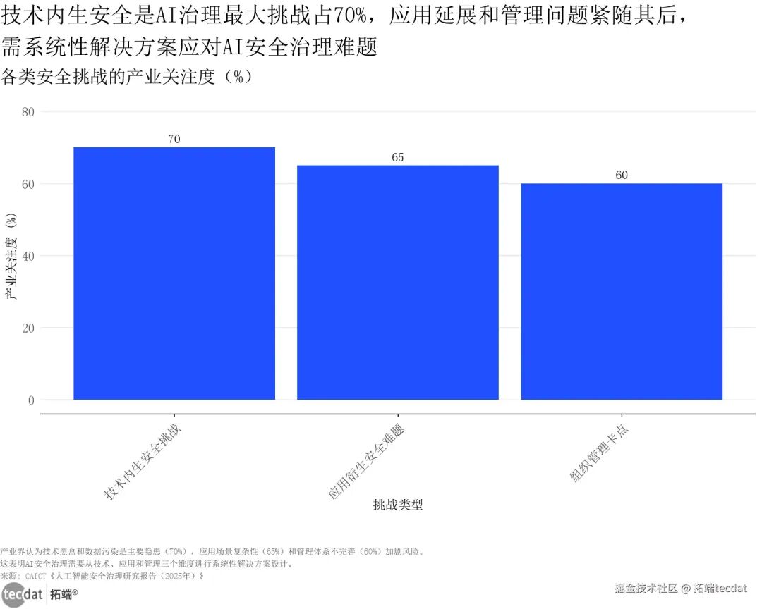 企业AI风险缓解比例华夫图表12 图表数据及PDF模板已分享到会员群从行业关注度来看,技术内生安全挑战成为核心痛点,70%的产业参与者认为技术黑盒、数据污染等原生风险是AI治理的最大难题;65%的受访者关注应用衍生安全问题,60%认为组织管理体系不完善加剧了风险,AI安全治理需要技术、应用、管理多维度协同发力。