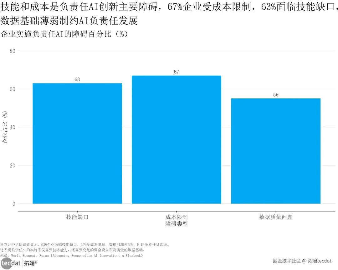 企业在落地负责任AI过程中,还面临技能、成本、数据三重障碍:67%的企业受成本限制,63%面临AI技能缺口,55%存在数据质量问题,这些因素直接制约了AI的合规化、负责任落地。